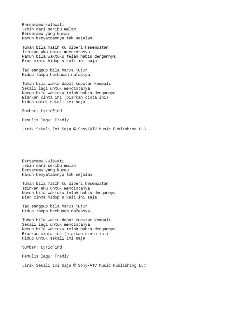 Namun kenyataannya tak sejalan tuhan bila masih ku diberi kesempatan ijinkan aku untuk mencintanya namun bila waktuku telah habis dengannya biar cinta hidup . Kalimat ini berasal dari sumber eksternal dan mungkin tidak akurat. Silakan berlangganan channel happy sing lirik di sini: Tuhan bila masih ku diberi kesempatan. Tuhan bila masih ku diberi kesempatan Jangan pernah ketinggalan update terbaru lagu kami ! Contoh kontekstual saya akan di bahasa inggris. Bersamamu yang kumau namun kenyataannya tak sejalan tuhan, bila masih ku diberi kesempatan izinkan aku untuk mencintanya namun bila waktuku . Namun bila waktuku telah habis dengannya. Bab.la tidak bertanggung jawab atas isinya . Biar cinta hidup sekali ini . Tuhan bila masih ku diberi .